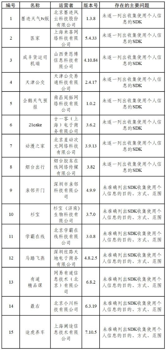 一、墨迹天气tv版、医家等15款App存在未逐一列出收集使用个人信息的SDK,未准确列出SDK收集使用个人信息的目的、方式、范围等问题(详见下表)。